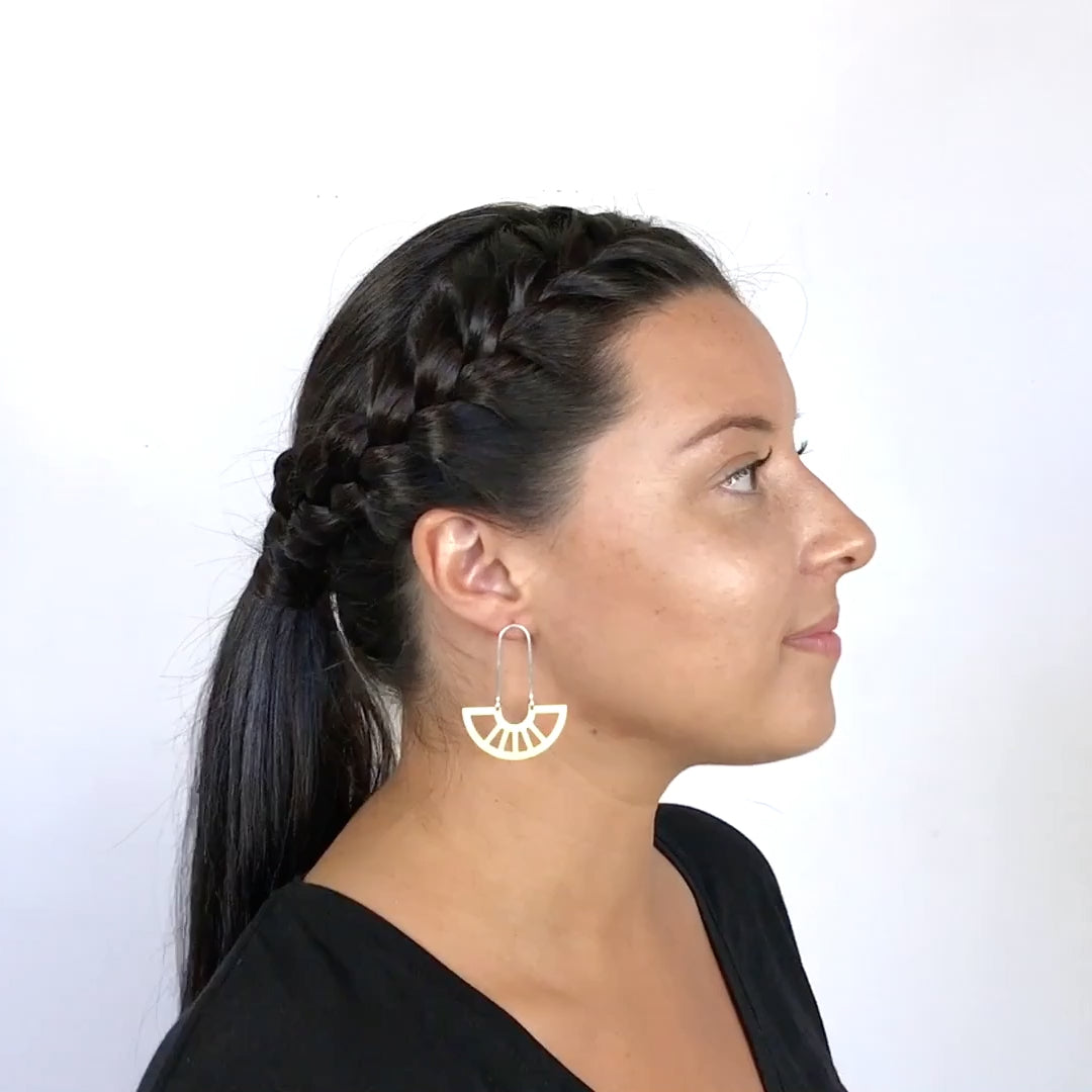 Materials: Brass or sterling silver semicircle pendants with Betsy & Iya hand-formed sterling silver hoop and sterling silver posts.